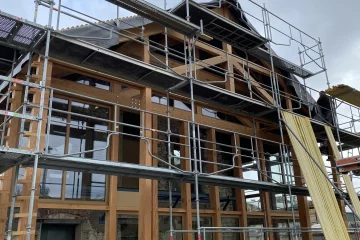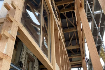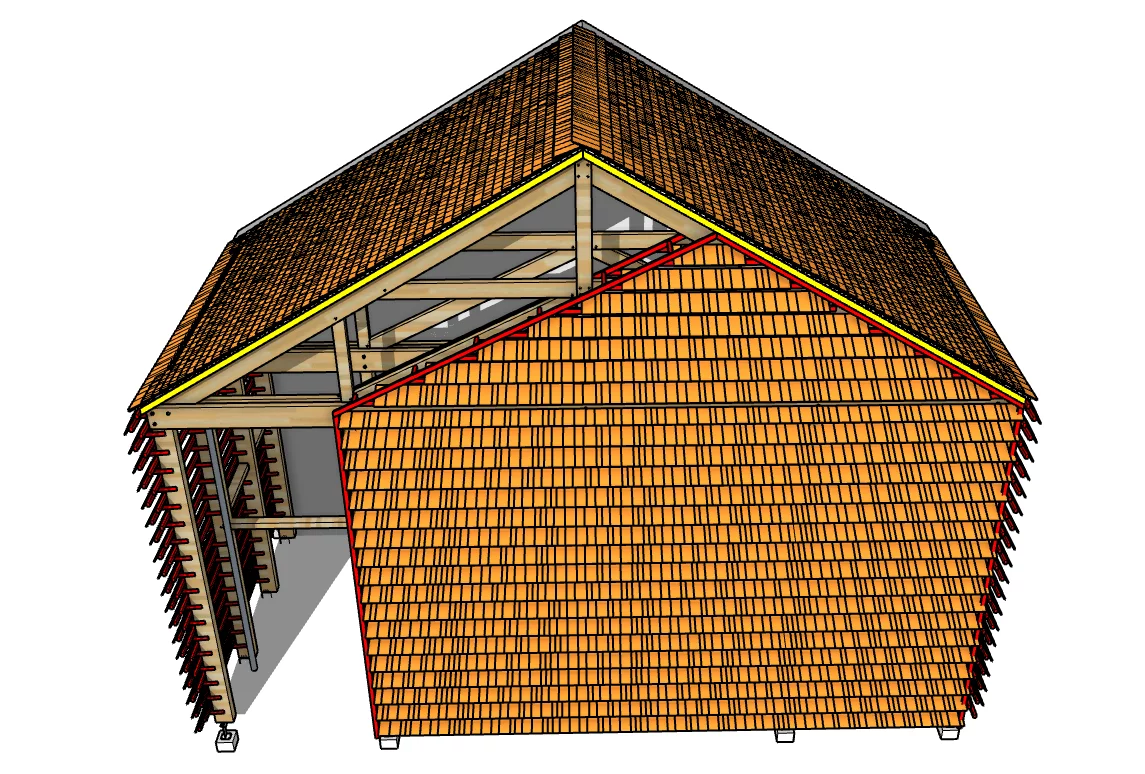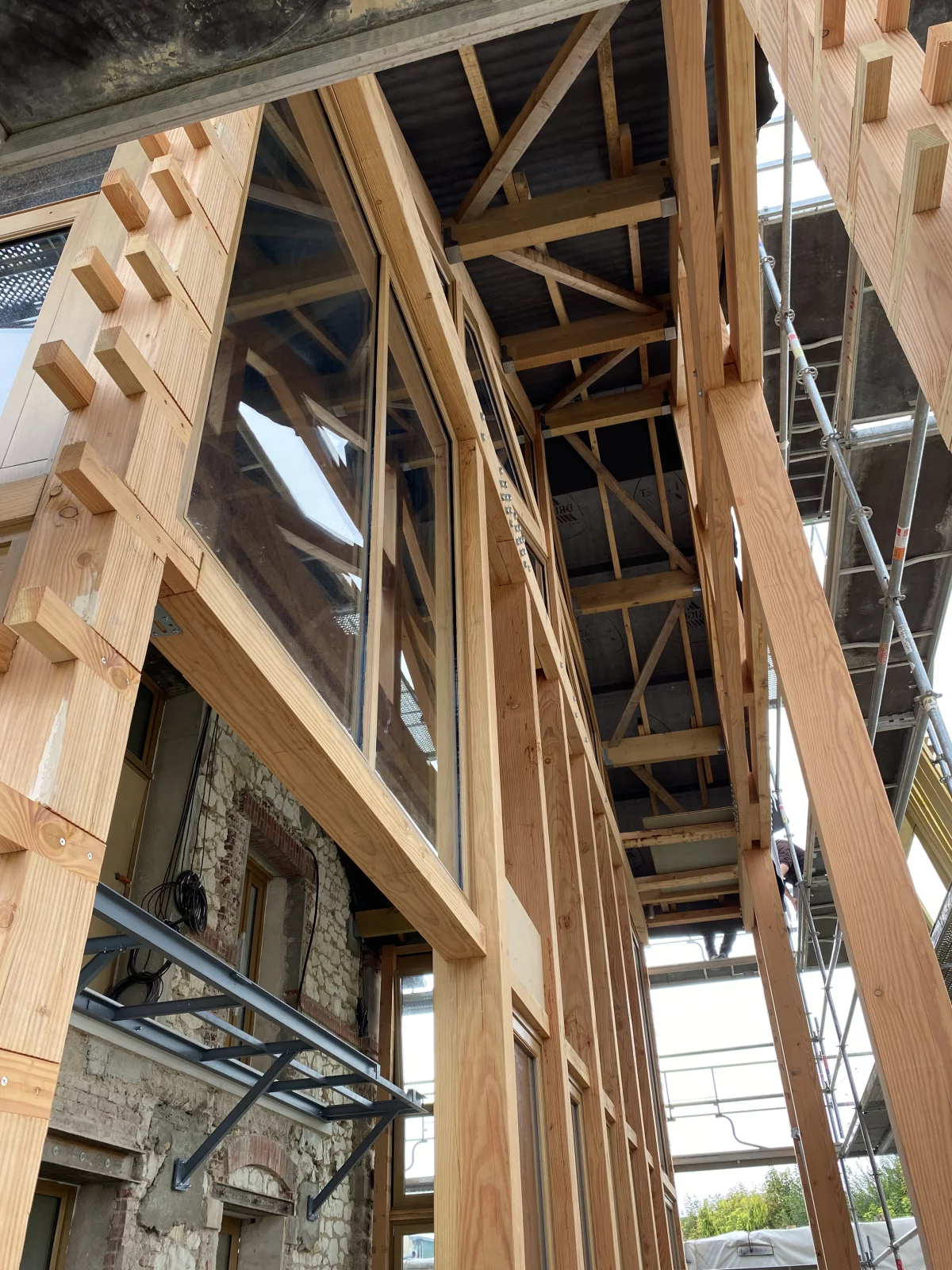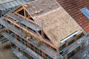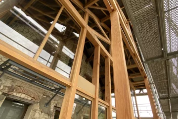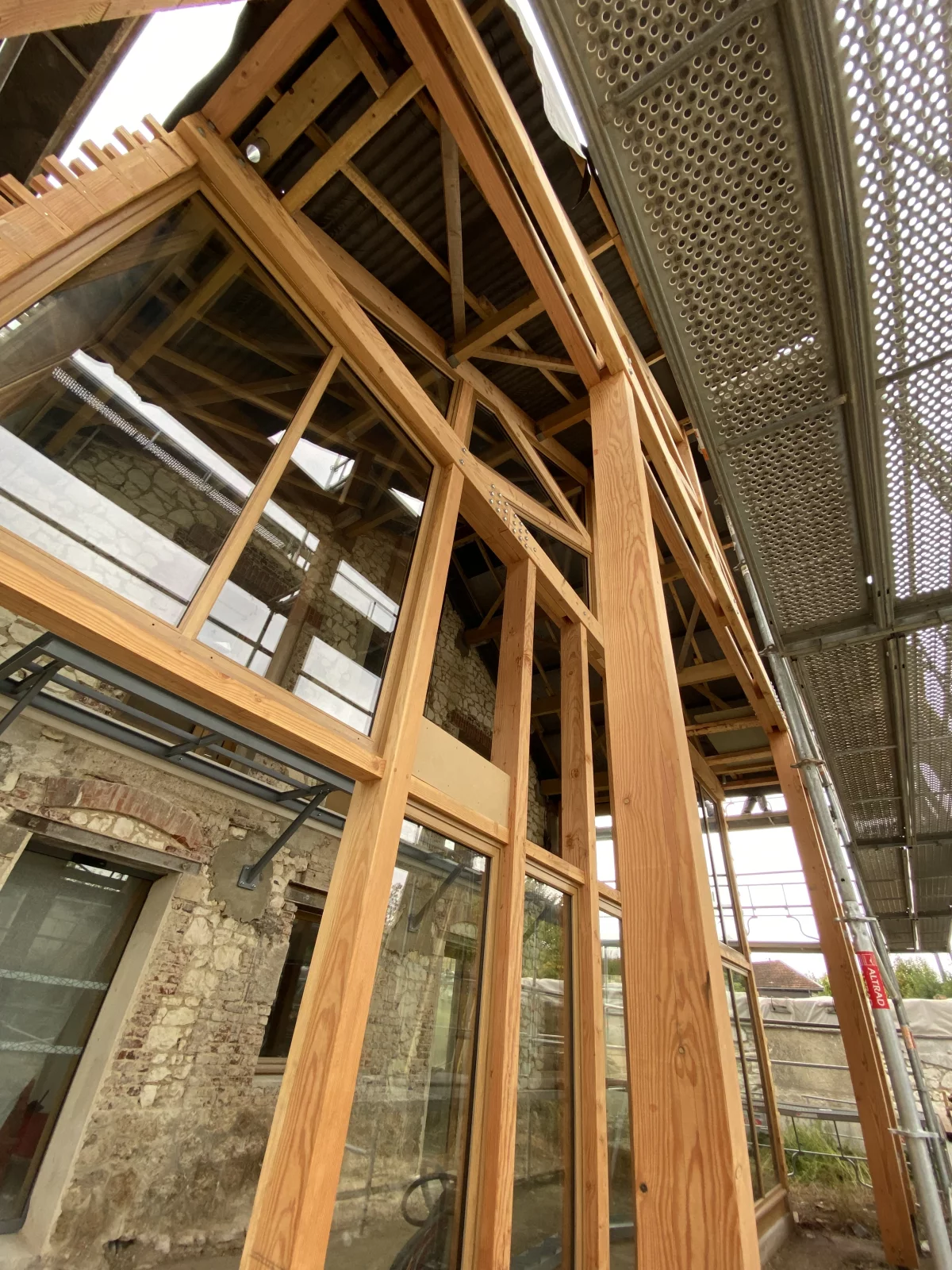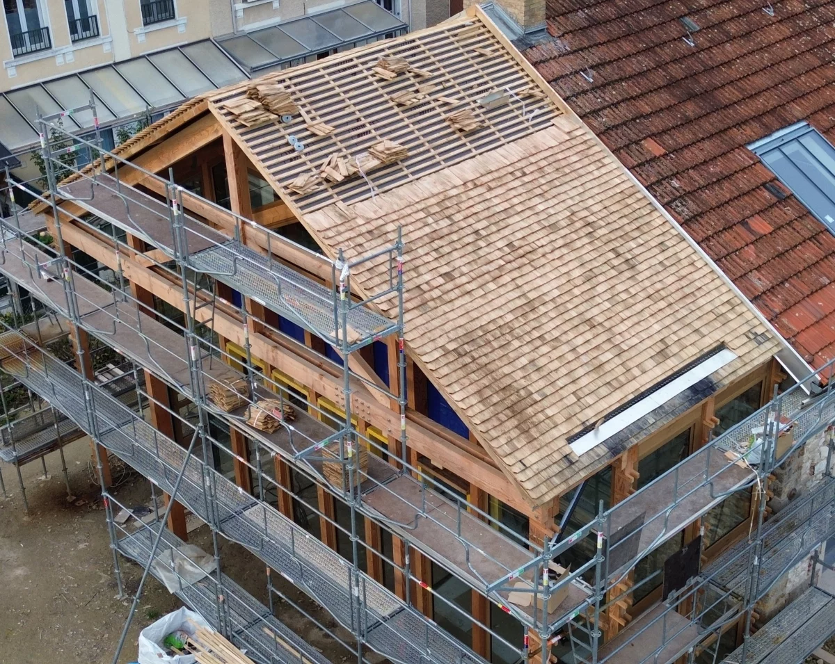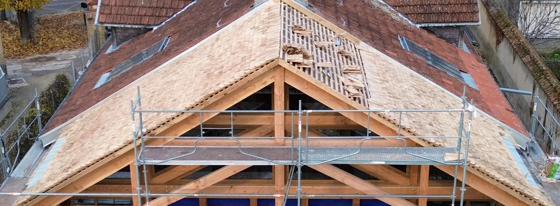 Réalisation d'une extension composée d'une charpente en douglas et d'une couverture en tavaillons en châtaignier.